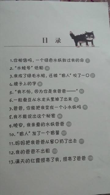 这本书分为九章,这九章里,一开始,水蛙每天都坐在河边等爸爸,每天都往河里放小船,因为 他去世的爸爸答应他,会变成水妖回来看他陪他过生日的,后来有一天,他的爸爸终于从自来水管里跑出来了,他是变成一团水草从自来水管里跑出来的,他的爸爸 真的变成了一个水妖,他的爸爸离不开水,他只好把爸爸养在鱼缸里,在这短短的几天里,水蛙和爸爸渡过了快乐的时光,这几天和爸爸共处的时光里,他也明白了 很多的道理。到了分别的时刻,他虽然不舍,但他没有哭泣,他把对爸爸的思念藏在心里,他告诉自己:爸爸不在,他必须长大。